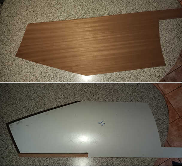 Also die Idee das Furnier zuerst auf eine 2mm starke PVC-Schaumplatte auf zu kleben und dann die so vorgefertigten Kompositplatten an den Bootskörper zu kleben erwies sich tatsächlich als gangbare Möglichkeit. Keinesfalls aber trotzdem nicht endblöde Fehler zu machen! Natürlich hatte ich einen Klebversuch gemacht, um zu sehen wie die Verklebung mit der PVC-Schaumplatte funktioniert. Und was soll ich sagen, der Versuch war einwandfrei und dann bringe ich das Blödstück fertig und bestelle einen anderen Kleber, dessen Klebekraft erfahrungsgemäß noch besser war. Ja, aber nicht mit PVC und das Malheur nahm seinen Lauf, die Verklebung mit diesem Kleber erwies sich als zu schwach und von dem getestetet, funktionierenden Kleber, hatte ich viel zu wenig und musste Nachschub erst einmal bestellen.